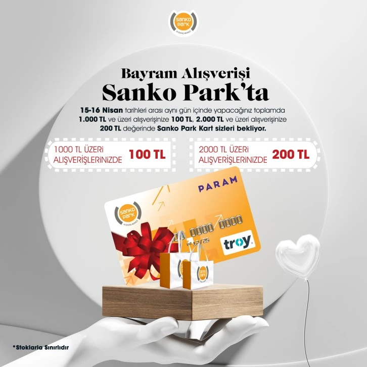 Yarın (15 Nisan Cumartesi) başlayacak kampanya, 16 Nisan Pazar günü sona erecek. Kampanya kapsamında ziyaretçiler, Sanko Park Alışveriş Merkezi’ndeki mağazalardan aynı gün içerisinde yapılacak toplamda bin TL ve üzeri alışverişlerde 100 TL, iki bin TL ve üzeri alışverişlerde 200 TL değerinde Sanko Park Kart kazanacak.