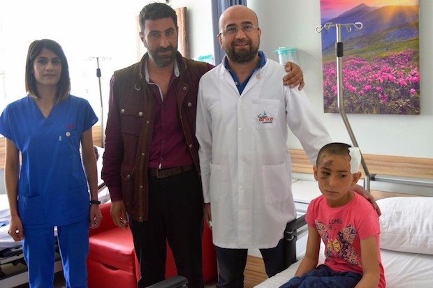Başına aldığı darbe sonucu kafatasının kırık olduğu ve durumunun ağır olduğu belirlenen küçük kız, tedavi için Türkiye’ye getirildi. Kilis Devlet Hastanesinde durumu riskli görüldüğü için ameliyat edilmeyen Amina, ailesi tarafından Özel Gaziantep Anka Hastanesi’ne getirildi. Özel Gaziantep Anka Hastanesi Beyin ve Sinir Cerrahisi Uzmanı Op. Dr. Erdal Yayla tarafından beyin tomografisi çekilen Amina’nın kafatasında parçalanmış kırık ve beyin kanaması tespit edildi. Hasta acil ameliyata alındı. Riskli olmasına rağmen önemli bir ameliyata imza atan Özel Gaziantep Anka Hastanesi Beyin ve Sinir Cerrahisi Uzmanı Op. Dr. Erdal Yayla, 1 buçuk saat süren operasyonun ardından, Amina’nın hayata yeniden tutunmasını sağladı.