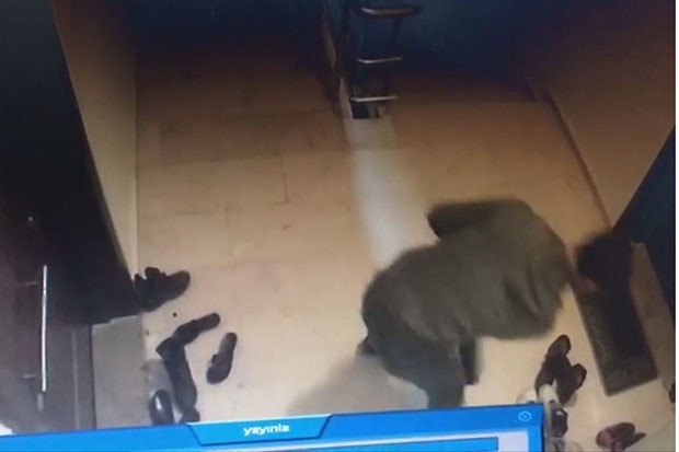 Ardından kapı önündeki ayakkabılardan bir kaçını gözüne kestiren şahıs, eğilerek ayakkabıları inceliyor. Hızlı bir şekilde hareket eden hırsız, duyduğu ses sonrası 19 saniye içerisinde 2 çift ayakkabıyı çalarak kayıplara karışıyor.
