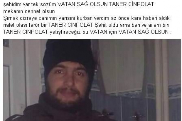Leyla Cinpolat’ın sosyal medya üzerinden Şehit Taner Cinpolat’ın resmini paylaşıp, “Şehidim var, tek sözüm vatan sağ olsun Taner Cinpolat mekanın cennet olsun. Şırnak Cizre'ye canımın yarısını kurban verdim. Az önce, kara haberi aldık lanet olası terör. Bir Taner Cinpolat şehit oldu ama ben ve ailem, vatan için bin Taner Cinpolat yetiştireceğiz. Vatan sağ olsun” ifadelerini kullanması kullanıcıları duygulandırdı.