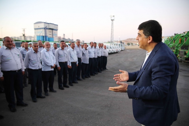 Başkan Rıdvan Fadıloğlu’nun kendileriyle bayramlaşmasının mutluluğunu yaşayan Temizlik İşleri Müdürlüğü ekipleri, şunları söyledi: