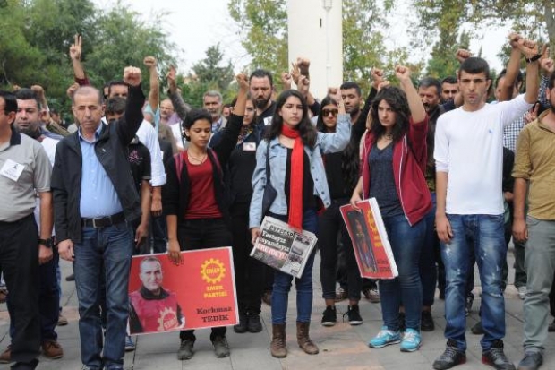 Yeşilsu Parkı’nda öğle saatlerinde bir araya gelen KESK, DİSK ve TMMOB üyeleri Ankara’daki patlamalara tepki göstermek için başlattıkları iş bırakma eylemini sürdürdü. Patlamada yaşamını yitiren Ali Deniz Uzatmaz’ın arkadaşlarının da yer aldığı eylemde, terör saldırısında ölenler için saygı duruşunda bulunuldu. Grup adına basın açıklamasını okuyan KESK Dönem Sözcüsü Ali Ersönmez, barış için meydanlarda olmaya devam edeceklerini ifade etti.