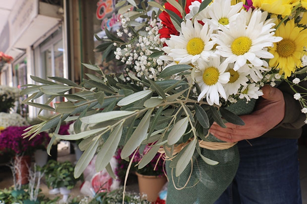 Çiçekçi esnafı 14 Şubat Şevgililer Günü dolayısıyla hazırlanan çiçek demetlerini zeytin dalları ile süsledi.
