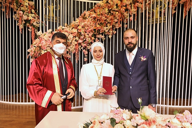 Gelin Nevin Palabıyık ise, “14 Şubat Sevgililer Günü nedeniyle nikahımızı bu özel günde kıymak istedik. Nikahımızı, Başkanımızın da kıyması bizim için ayrıca güzel oldu. Çok mutluyum. Başkanımıza da bizleri bu özel günümüzde yalnız bırakmadığı için çok teşekkür ediyorum. Bu özel günümüzde yanımızda olan tüm aile dostlarımıza da teşekkür ediyorum” ifadelerini kullandı.