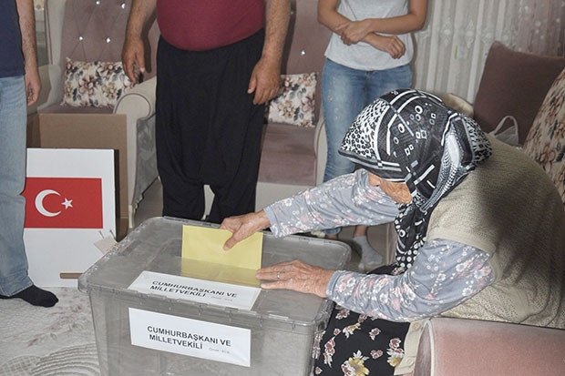 Polis güvenliği ile gidilen evlerde engelli ve hastalar oylarını kullandı. Siyasi parti temsilcileri, emniyet görevlilerinin de bulunduğu 9 kişilik ekipten oluşan seyyar sandığın başkanlığını yapan İbrahim Halil Karahan, "Hastalığı veya engeli nedeniyle yatağa bağımlı olan seçmenlerimize oylarını kullandırıyoruz. İlçemizdeki 13 mahallede 13 seçmenimizin evine giderek güvenli şekilde oylarını kullanmalarını sağlayacağız" dedi. Yaşlılığa bağlı yürüme zorluğu çeken 92 yaşındaki Gülizar Özbal, oyunu evine getirilen seyyar sandıkta kullandı. Yatalak hasta olan 71 yaşındaki Yusuf Koyuncu da seyyar sandıkta oyunu kullandı ve uygulamadan dolayı görevlilere teşekkür etti.