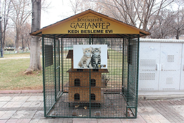 Gaziantep Büyükşehir Belediyesi, sıcaklığın eksilerde olduğu bu günlerde sokak kedileri için kedi besleme evi ve barınak yaptı. Yapılan barınaklarda sadece kediler değil köpeklerde barınıyor. Yemlerin bile düzenli olarak konulduğu barınaklardan dolayı hayvan severler Büyükşehir Belediyesine teşekkür ettiler.