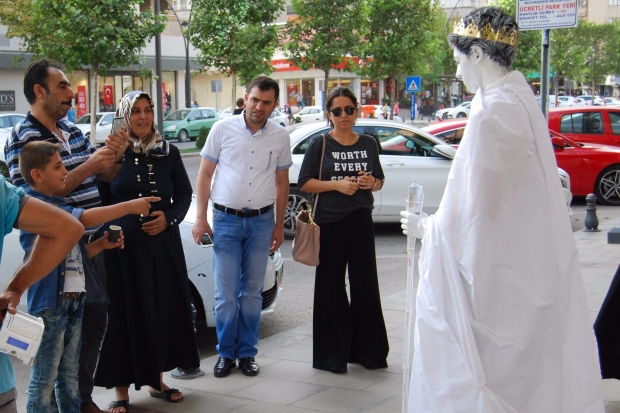 Gaziantep’te düzenlenen sokakta sanat etkinliğine katılan 15 sanatçı tarafından sergilenen canlı heykel performansı yoğun ilgi gördü.