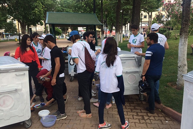 Suriyeli mülteciler Gaziantep Kent Konseyi üyeleri ile birlikte çevreye dikkat çekmek amacıyla çöp konteynerlerini boyayıp, parkı temizledi.