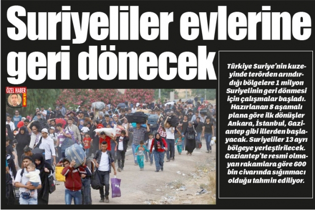 Türkiye Suriye’nin kuzeyinde terörden arındırdığı bölgelere 1 milyon Suriyelinin geri dönmesi için çalışmalar başladı. Hazırlanan 8 aşamalı plana göre ilk dönüşler Ankara, İstanbul, Gaziantep gibi illerden başlayacak. Suriyeliler 13 ayrı bölgeye yerleştirilecek. Gaziantep’te resmi olmayan rakamlara göre 600 bin civarında sığınmacı olduğu tahmin ediliyor.