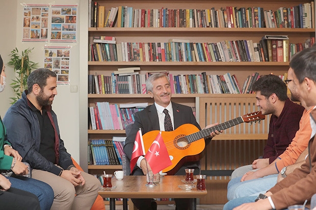 Gaziantep Üniversitesi'nde gençlerle sohbet eden Şahinbey Belediye Başkanı Mehmet Tahmazoğlu, marifetini gösterdi ve gitar çaldı. Gençlerle hoş sohbet eden Tahmazoğlu, sorun dinledi, gençlere tavsiyelerde bulundu.