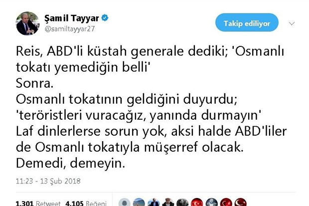 Ak Parti Milletvekili Şamil Tayyar, sosyal medya hesabından ABD'li Korgeneral Paul E. Funk'ın, "Bizi vurursanız agresif karşılık veririz" ifadelerine, "Ömürlerinde hiç Osmanlı tokadı yememiş oldukları da çok açıktır" cevabını veren Cumhurbaşkanı Recep Tayyip Erdoğan'a destek verdi. Erdoğan, paylaşımında, "Reis, ABD'li küstah generale dedi ki, 'Osmanlı tokadı yemediğin belli.' Sonra. Osmanlı tokadının geldiğini duyurdu: 'Teröristleri vuracağız, yanında durmayın'. Laf dinlerlerse sorun yok, aksi halde ABD'liler de Osmanlı tokadıyla müşerref olacak. Demedi, demeyin" ifadelerini kullandı.