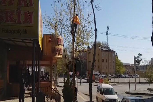 Gaziantep’in Şehitkamil ilçesinde bir genç, bir iş yerinin önündeki yaklaşık 10 metre yüksekliğindeki ağaca, elinde testere ile birlikte tırmandı. Hiçbir güvenlik tedbiri almadan dalları budayan genç, zaman zaman vatandaşlara korkulu anlar yaşattı. Ölümle burun buruna olan genç, zaman zaman ağaca tutunmakta zorluk yaşadı. Tehlikeye rağmen rahat tavırları dikkat çeken genç, zaman zaman ağaçta cep telefonu ile de konuştu. Çevredekilerin meraklı ve korkulu bakışları arasında konuşmasını sürdüren genç, telefonu kapatıp cebine koyduktan sonra da işine devam etti.