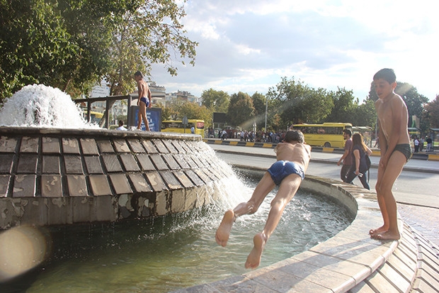 Gaziantep’te aşırı sıcaklara dayanamayan çocuklar şehrin göbeğindeki süs havuzlarına girdi.