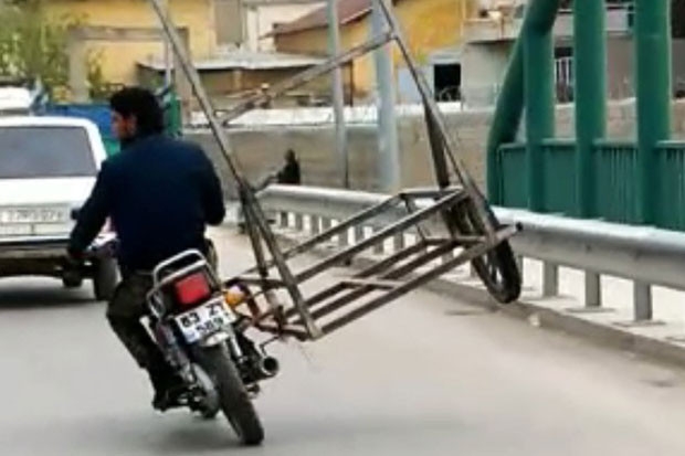 Trafiğin yoğun olduğu saatte bir sürücünün üç tekerlekli motosikletin tekerini havaya kaldırarak yolculuk etmesi, görenlerin yüreklerini ağza getirdi.