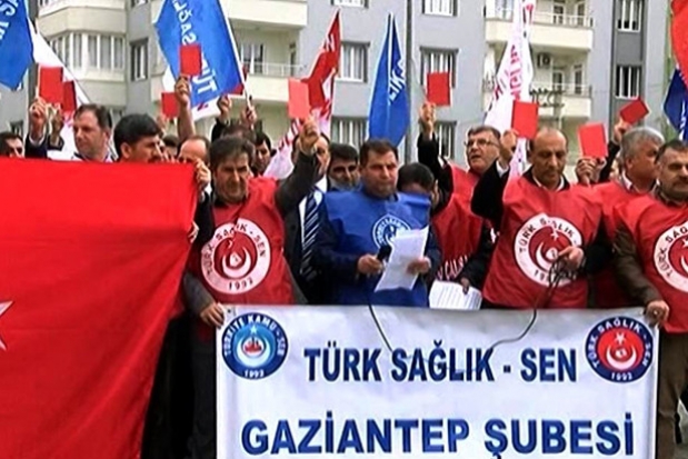 Gaziantep'te Sağlık Sen üyeleri yaptıkları eylemde, bir sempatizan tarafından Devlet Hastanesinde çalışan sendika üyesi sağlık görevlilerinin darp edildiğini söyleyerek, PKK’ya kırmızı kart gösterdi.