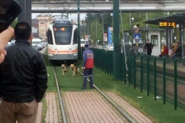 Gaziantep'te tramvay yolundaki 2 kurt köpeği ilginç görüntüye neden oldu. Tramvaydan önce durağa gelen köpekler, bir görevlinin çabası ile demiryolundan çıkarıldı.