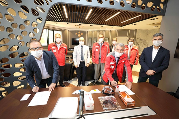 Türk Kızılay’ı tarafından Gaziantep Üniversitesi Şahinbey Araştırma ve Uygulama Hastanesi’ne bağışlanan 500 kutu dezenfektan, 50 siperlik, iki bin adet üç katlı maske, bin 500 Ventilli FFP2 maske, beş bin eldiven, 250 gözlük ve bin 750 tulum Kızılay Gaziantep Şube Başkanı Prof. Dr. Nihat Yıldırım ve Gaziantep Üniversitesi Rektörü Prof. Dr. Ali Gür tarafından imzalanan protokolle teslim edildi.