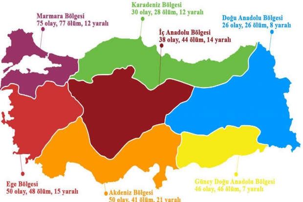 Silahla işlenen “kadın cinayetlerinin haritasına bölge bölge bakıldığında Marmara Bölgesi’nde basına yansıyandan 75 olay içinde, 34 olayla İstanbul en çok kadın cinayetinin işlendiği il olarak aynı zamanda Türkiye genelinin de birinci sırasında bulunuyor. Bu bölgede, 13 kadın cinayeti, 11 ölü, üç yaralıyla ikinci sırayı Kocaeli işgal ediyor. Bursa’da geçen yıl yedi kadın cinayeti basına yansıdı, bu cinayetlerde 9 kişi öldü.