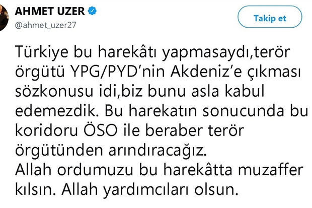 Türk Ordusu'na zafer için dua da eden Uzer, "Allah ordumuzu bu harekatta muzaffer kılsın. Allah yardımcıları olsun" ifadelerine yer verdi.