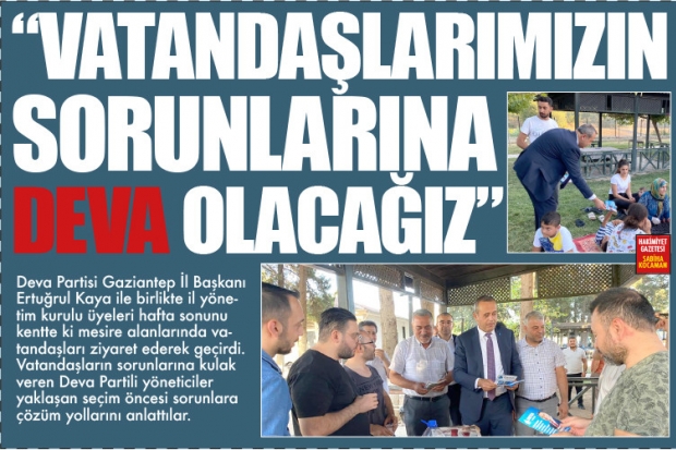 Deva Partisi Gaziantep İl Başkanı Ertuğrul Kaya ile birlikte il yönetim kurulu üyeleri hafta sonunu kentte ki mesire alanlarında vatandaşları ziyaret ederek geçirdi. Vatandaşların sorunlarına kulak veren Deva Partili yöneticiler yaklaşan seçim öncesi sorunlara çözüm yollarını anlattılar.