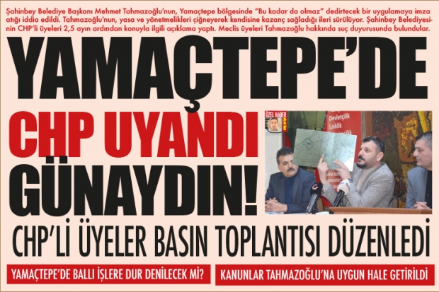 Cumhuriyet Halk Partili Şahinbey Belediye Meclis Üyeleri Şahinbey Belediye Başkanı Mehmet Tahmazoğlu hakkında kendisine aiz araqzide usulsüzlük yaptığı iddiasıyla suç duyurusunda bulundular. CHP'li üyelerin Aralık ayında ortaya atılan bu iddialar karşısında Mart ayında açıklama yapmaları kafalarda soru işaretleri bıraktı. Kendine ait arazide usulsüzlük yapan Şahinbey Belediye Başkanı Mehmet Tahmazoğlu'nu istifaya davet eden CHP'li meclis üyeleri konunun takipçisi olacak.