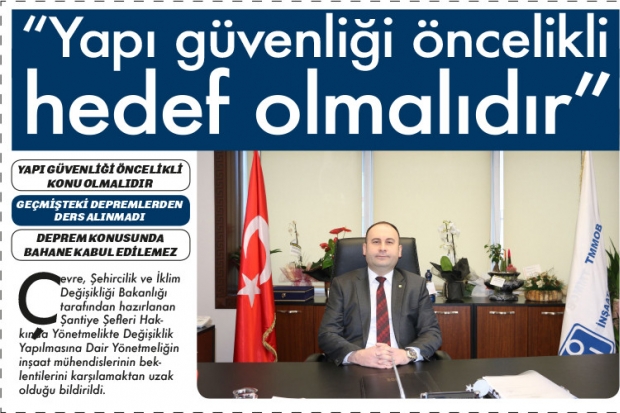 İMO Şube Başkanı Güçyetmez, TMMOB İnşaat Mühendisleri Odası tarafından, güvenli yapı üretimi ve yapı üretim sürecinin sağlıklı bir şekilde yürütülebilmesi için şantiye şefliği görevinin düzenlenmesi hakkında kapsamlı çalışmalar yapıldığını ve bu çalışmaların rapor haline getirilerek ilgili kurum ve kuruluşlar, milletvekilleri ve kamuoyu ile paylaşıldığını belirterek, "Odamızın katkılarıyla hazırlanan Şantiye Şefleri Hakkında Yönetmelik taslağı TMMOB tarafından Çevre. Şehircilik ve İklim Değişikliği Bakanlığına gönderilmiştir. Bakanlık, yukarıda bahsedilen çalışmalar doğrultusunda Şantiye Şefleri Hakkında Yönetmelikte revize yapma ihtiyacı duymuş, hazırladığı değişiklik taslağını da ilgili kurum ve kuruluşlarla paylaşmıştır. Ülkemizde yapı güvenliğinin sağlanması açısından elzem bir rolü olan şantiye şefliği yönetmeliği konusunda Bakanlık tarafından yapılan çalışmanın ne yazık ki ihtiyacı karşıladığını ifade etmek mümkün değildir" dedi.