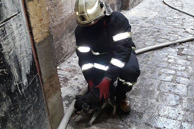 Gaziantep Büyükşehir Belediyesi İtfaiye Daire Başkanlığı ekipleri, 5 katlı binada çıkan yangında mahsur kalan bir yavru köpeği alevlerin arasından kurtardı.