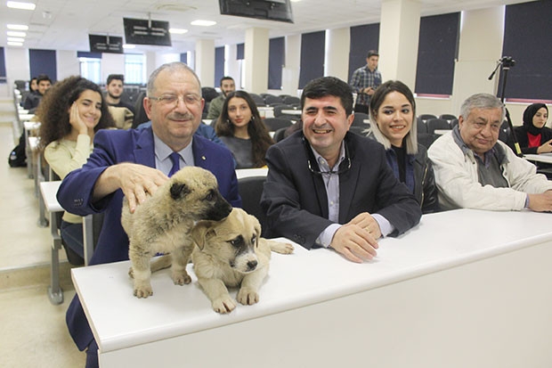 Konuşmaların ardından öğrenciler ilk derste misafir iki yavru köpekle uygulamalı olarak hayvan hukuku konusunda bilgilendirildi.