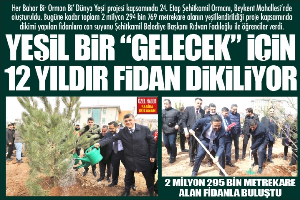 Şehitkamil Belediyesi, Her Bahar Bir Orman Bi’ Dünya Yeşil projesi kapsamında bugüne kadar kurmuş olduğu 24 etap ormanda toplam 2 milyon 294 bin 769 metrekare alan üzerinde 204 bin 806 adet fidanı toprakla buluşturdu. Fidan dikim programına; Şehitkamil Kaymakamı Ömer Kalaylı, Şehitkamil Belediye Başkanı Rıdvan Fadıloğlu, Şahinbey Belediye Başkan Yardımcısı Cuma Güzel, Şehitkamil Belediye Başkan Yardımcıları Murat Özgüler, Ceyda Gürsel, Serkan Özatıcı, Mehmet Ali Korkmaz, AK Parti Şehitkamil İlçe Başkanı Mehmet Yılmaz, AK Parti Şehitkamil İlçe Kadın Kolları Başkanı Hülya Kılıç, Ak Parti Şehitkamil İlçe Gençlik Kolları Başkanı Mustafa Durmuş, Şehitkamil Belediyesi Meclis üyeleri, mahalle muhtarları, öğretmenler ve öğrenciler katıldı.