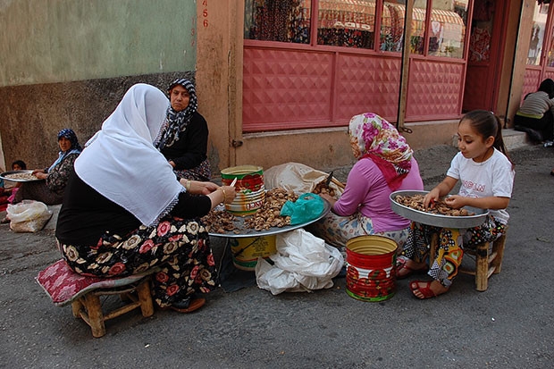 Taşra mahallelerde aile ekonomilerine katkı sağlamak isteyen ev hanımları fıstık ve ceviz kırarak yaşamlarına devam ediyorlar.