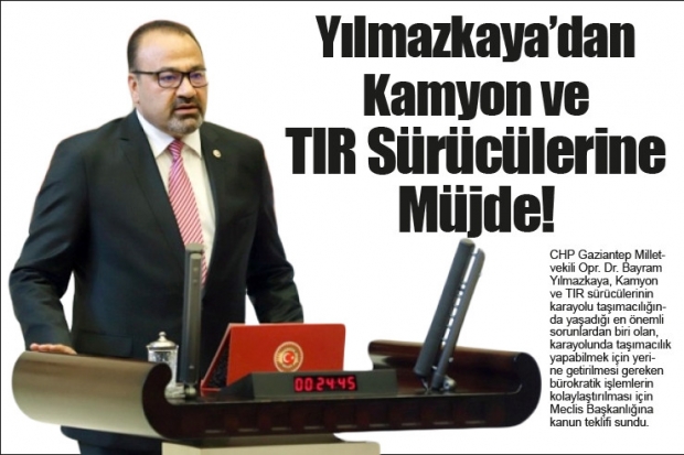 CHP Gaziantep Milletvekili Opr. Dr. Bayram Yılmazkaya, Kamyon ve TIR sürücülerinin karayolu taşımacılığında yaşadığı en önemli sorunlardan biri olan, karayolunda taşımacılık yapabilmek için yerine getirilmesi gereken bürokratik işlemlerin kolaylaştırılması için Meclis Başkanlığına kanun teklifi sundu.