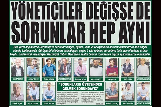 Son yerel seçimlerde Gaziantep’in sorunları ulaşım, eğitim, imar ve Suriyelilerin durumu olmak üzere dört başlık altında toplanıyordu. Görüşlerini aldığımız vatandaşlar, geçen 3 yıla rağmen sorunların hala aynı olduğunu ortaya koydu. Gaziantepli vatandaşlar Hakimiyet Haber Merkezine kentin önemli sorunlarına ilişkin açıklamalarda bulundular.