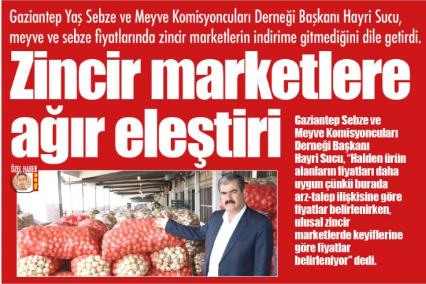 Gaziantep Sebze ve Meyve Komisyoncuları Derneği Başkanı Hayri Sucu, “Halden ürün alanların fiyatları daha uygun çünkü burada arz-talep ilişkisine göre fiyatlar belirlenirken, ulusal zincir marketlerde keyiflerine göre fiyatlar belirleniyor” dedi. Yerli marketlerin manav reoanları için alış verişi halden yaptıklarına dikkat çeken Sucu, zincir marketlerin ise manav alışlarını yerinden uygun alarak, ,stedikleri fiyat politikasınıo uyguladıklarını anlattı.
