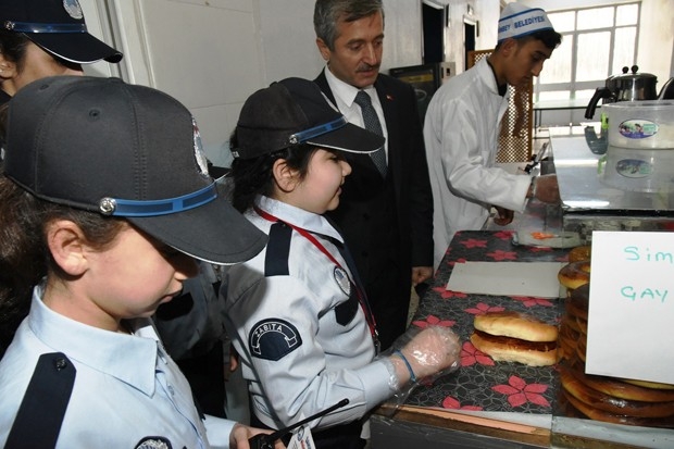 Okullarda bulunan kantin görevlilerinden istedikleri iş yeri ruhsatlarını inceleyen minik zabıtalar, satılan ürünlerin son kullanma tarihlerini ve hijyen koşullarını da denetledi.