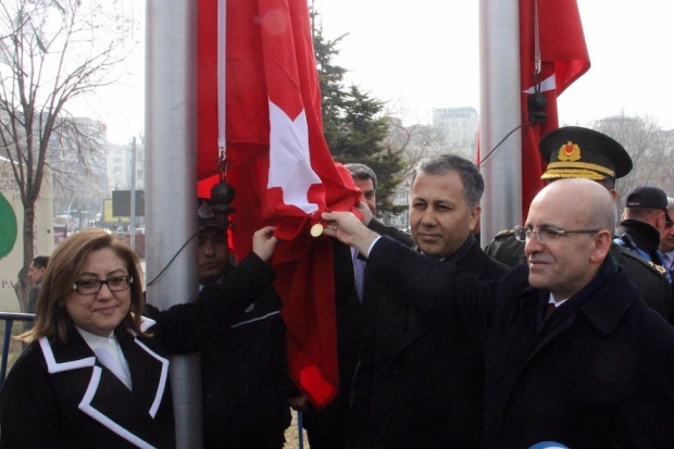 Daha sonra Başbakan Yardımcısı Şimşek, Vali Yerlikaya ve Başkan Şahin ile birlikte Türk bayrağına gazilik madalyası taktı.