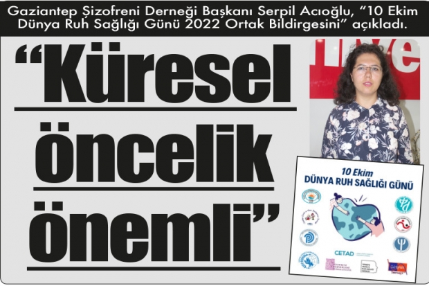 "Dünya Ruh Sağlığı Federasyonu 10 Ekim Dünya Ruh Sağlığı Günü temasını 2022 yılı için "Ruh Sağlığını ve Ruhsal İyilik Halini Küresel Bir Öncelik Haline Getirelim" olarak belirlemiştir" şeklinde konuşan Gaziantep Şizofreni Derneği Başkanı Serpil Acıoğlu, önemli açıklamalarda bulundu.