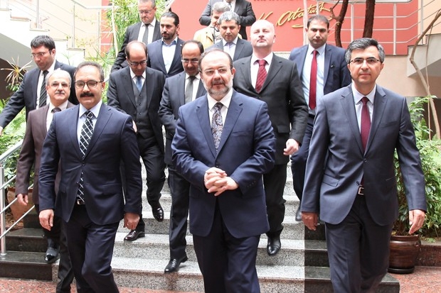 Rektör yardımcıları Prof. Dr. Savaş Gürsoy ve Prof. Dr. Metin Bedir, Genel Sekreter Doç. Dr. Ayhan Doğan, İlahiyat Fakültesi Dekan Vekili Prof. Dr. Sehmus Demir, Rektör Danışmanı Doç. Dr. Necip Fazıl Yılmaz, Genel Sekreter Yardımcısı Mehmet Ali Eminoğlu, İl Müftüsü Ahmet Çelik ve Diyanet yöneticilerinin de bulunduğu ziyarette, Diyanet Başkanı Prof. Dr. Görmez Rektör Prof. Dr. Ali Gür’e Hadislerle İslam Seti hediye ederken, Rektör Gür de Başkan Görmez’e Naci Topçuoğlu Meslek Yüksekokulu öğrencilerinin işlediği çini vazo ile, savaş öncesi Halep’te bulunan ve yok olan eserlerin envanterinin olduğu Halep’te Adım Adım Osmanlının İzinde Kitabı takdim etti. Kitabı dikkatle inceleyen Başkan Görmez, “Halep’te sadece canlar yok edilmedi. Halep’te medeniyetler de yok edildi” dedi. Görmez, daha sonra İlahiyat Fakültesi’nde de incelemelerde bulundu. Burada öğrencilerle sohbet eden Diyanet İşleri Başkanı Prof. Dr. Mehmet Görmez’e Dekan Vekili Demir tarafından bakır işlemeli şamdan hediye edildi.