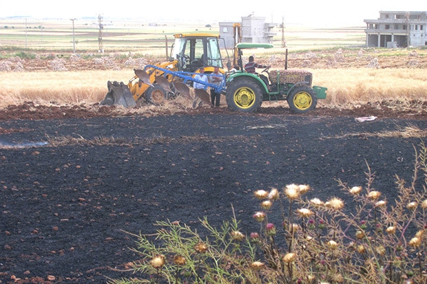 Gaziantep'in Araban ilçesinde, hasada hazır buğday ve arpa tarlasında çıkan yangında 52 dönümlük alanda tonlarca buğday ve arpa yandı. Üreticilerin bir yıllık emeği çıkan yangınla kül oldu.