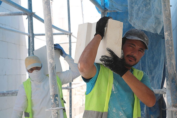 Tarihi eserlerin restorasyon çalışmalarında kullanılan doğal beyaz taşlara şekil verilmesinde büyük emek harcayan taş işçileri, 55 dereceyi bulan sıcak havanın da etkisiyle ağır koşullarda çalışıyor. Gaziantep’te sıcaklığın 55 dereceyi bulduğu bugünlerde taş işçileri binaların restorasyon çalışmalarını büyük bir titizlikle sürdürüyor. Ellerindeki 5’er kiloluk çekiçlerle taşlara şekil veren taş işçileri sıcak havaya rağmen taş taşıyarak ekmeklerini taştan çıkarıyor.