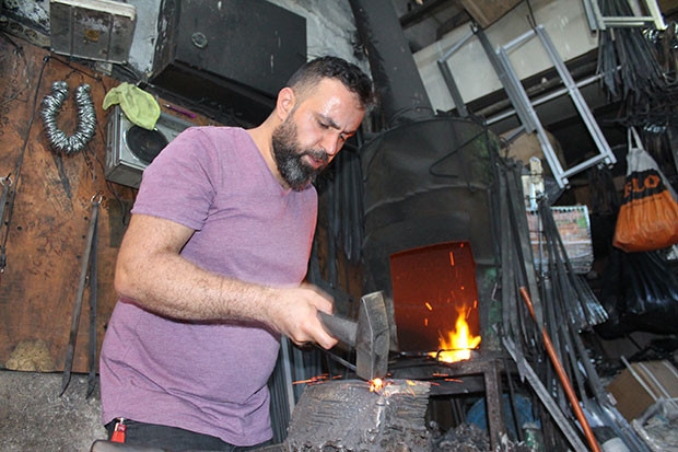 Gaziantep’te çocukluğundan beri kebap şişi üretimi yapan 35 yaşındaki Halil İbrahim Yurban, aşırı sıcak havalarda 60 dereceye ulaşan ortamda demir dövüyor. Gaziantep Bakırcılar Çarşısı’ndaki dükkanında çocukluğundan beri sürdürdüğü baba mesleğini devam ettirdiğini belirten Yurban, "Çocukluğumdan beri burada çalışıyorum. Şiş yapılırken, önce ana malzememizi boylarına göre ayarlıyoruz. İsteğe göre uçlarını ve arkalarını döverek hazır hale getiriyoruz" dedi. Ateşin karşısında çalıştıklarını söyleyen ve son günlerde özellikle sıcak havalar nedeniyle zorluk yaşadıklarını aktaran Yurban, “Hava sıcaklığı ocağın karşısında 60 derece oluyor. Ocağın içerisi ise 200 dereceye kadar çıkıyor" şeklinde konuştu. Mesleğinin son temsilcisi olduğunu ve çalıştıracak çırak bulamadıklarını da açıklayan Yurban, "Bizim ailede bu işi yapan en son kişi benim. Biz öldükten sonra bu işi yapacak kimse yoktur” ifadelerini kullandı.