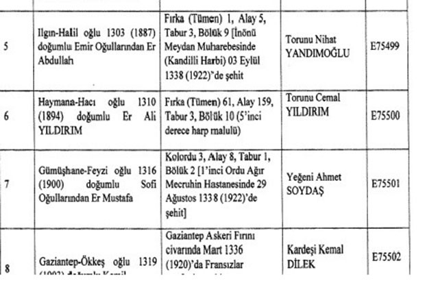 "Akşehir - Ali oğlu 1307 (1891) doğumlu Ağır Topçu Çavuşu Abdullah Bacak, Vakfıkebir - Mehmet oğlu 1309 (1893) doğumlu Er Ömer Sağlam, Vakfıkebir - Hasan oğlu 1315 (1889) doğumlu Er Hüseyin Usta, Kalecik - Veli oğlu 1309 (1893) doğumlu Er Turhan Ural, Ilgın - Halil oğlu 1303 (1887) doğumlu "Emir Oğulları"ndan Er Abdullah, Haymana - Hacı oğlu 1310 (1894) doğumlu Er Ali Yıldırım, Gümüşhane - Feyzi oğlu 1316 (1900) doğumlu "Sofi Oğulları"ndan Er Mustafa, Gaziantep - Ökkeş oğlu 1319 (1903) doğumlu Kamil".