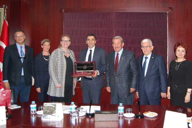 ABD Ekonomi Müsteşarının GTO’yu ziyaretinde Yönetim Kurulu Başkan Yardımcısı Sadık Koçak ve Yönetim Kurulu üyesi M. Sami Akay’da hazır bulunurken, ziyaret anısına Ekonomi Müsteşarı Erika Olson’a hediye takdim edildi.