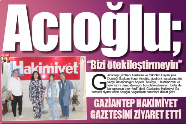 Gaziantep Hakimiyet Gazetesi Yazı İşleri Müdürü Sabiha Kocaman ile Hakimiyet Gazetesi Editörü Merve Tanrıöver ile yaşadıkları sorunlar üzerine fikir alış verişinde bulunan Gaziantep Şizofreni Hastaları ve Yakınları Dayanışma Derneği Başkanı Serpil Acıoğlu, toplumun yaşadıkları sorunlar karşısında duyarlılık beklediklerini ifade etti. Acıoğlu, “Bizi damgalamayın” çağrısında bulundu. Toplumda şizofreni hastalarına ve yakınlarına yönelik bir ön yargı olduğunu belirten Acıoğlu, “Gerek hastalarımız, gerekse yakınları kendilerini tanıtmaktan kaçınıyorlar. Derneğimizi kurduk, yönetimimizin tamamına yakını gönüllülerden oluşuyor. Hiç birisi hasta ve yakını değil. Bu da toplumdaki ön yargıdan kaynaklanıyor. Toplumda şizofreni hastaları saldırır, öldürür gibi yanlış algılar var. Yıllarca filmlerde ve gazete haberlerinde şizofreniler hep büyük tehlike gibi gösterildi. Şizofreni hastalarının sağlıklı bir insana göre suç işleme şansı çok daha düşük. Bizim çağrımız, lütfen şizofreni ile ilgili ön yargılı olmayın. Gaziantep’te yaklaşık 8 bin civarında şizofreni hastası var. Aileleri ile birlikte önemli bir topluluk oluşturuyorlar. Bu insanlar dışlanmasın” dedi.