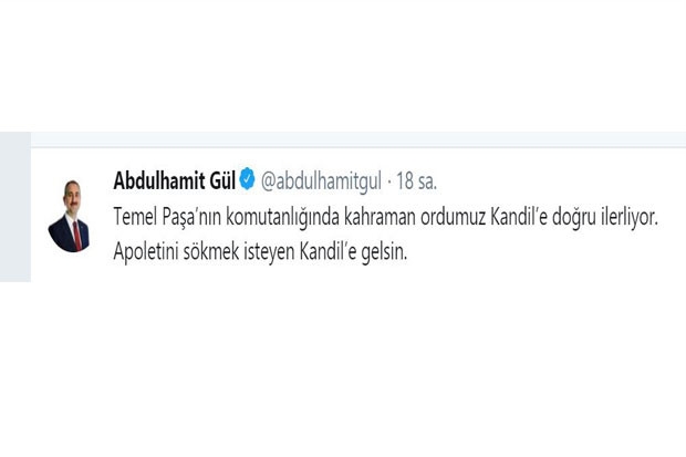 CHP'nin cumhurbaşkanı adayı Muharrem İnce, geçtiğimiz hafta bir programda 2. Ordu Komutanı Korgeneral İsmail Metin Temel'in Cumhurbaşkanı Recep Tayyip Erdoğan'ı alkışlamasına tepki göstererek, "Göreve gelirsem o komutanın apoletlerini sökeceğim" demişti. Seçim çalışmaları için Gaziantep'te bulunan Adalet Bakanı Abdulhamit Gül, İnce'nin bu açıklamasına sosyal medya hesabından yaptığı paylaşımla tepki göstererek, "Temel Paşa’nın komutanlığında kahraman ordumuz Kandil’e doğru ilerliyor. Apoletini sökmek isteyen Kandil’e gelsin" dedi.
