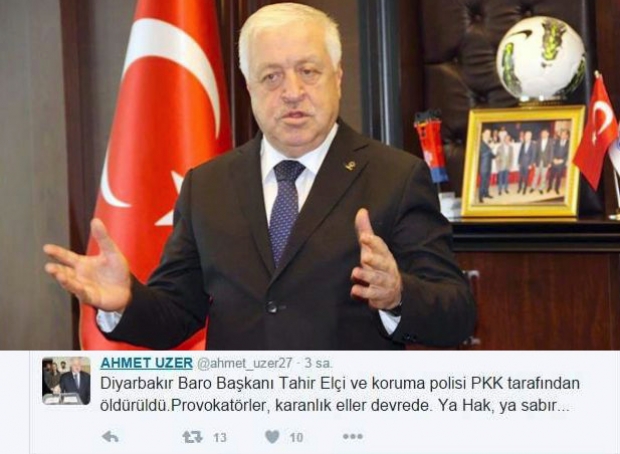 AK Parti Gaziantep Milletvekili Ahmet Uzer, sosyal medya hesabından Diyarbakır Barosu Başkanı Tahir Elçi’nin öldürülmesini kınadı.