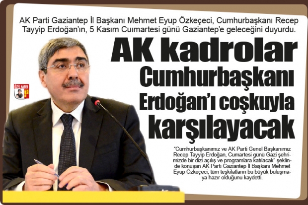 "Cumhurbaşkanımız ve AK Parti Genel Başkanımız Recep Tayyip Erdoğan, Cumartesi günü Gazi şehrimizde bir dizi açılış ve programlara katılacak" şeklinde konuşan AK Parti Gaziantep İl Başkanı Mehmet Eyup Özkeçeci, tüm teşkilatların bu büyük buluşmaya hazır olduğunu kaydetti.
