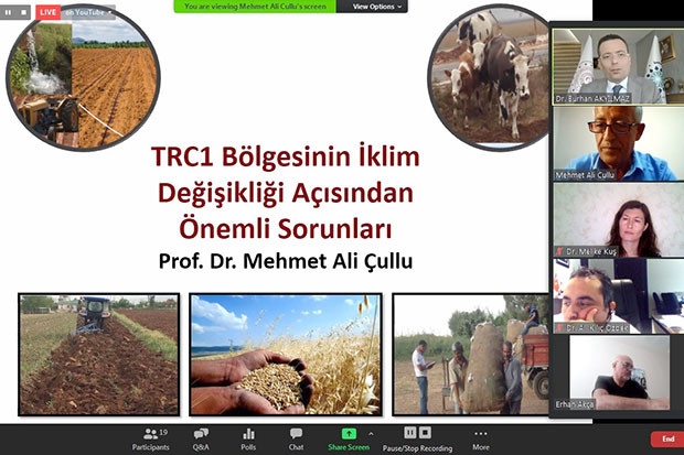 Harran Üniversitesi Ziraat Fakültesi Öğretim Üyesi Prof. Dr. Mehmet Ali Çullu da TRC1 Bölgesi’nin İklim Değişikliği açısından önemli sorunları başlıklı sunum gerçekleştirdi. Çullu, “Türkiye topraklarının yüzde 60’ı kurak durumda. Ortalama 5 ay yağış düşmez ve yüksek sıcaklık olursa toprak nemini kaybeder. Bölgemiz şu an bile sıkıntılı, bu şekilde devam ederse gelecek projeksiyonu daha da sıkıntılı hale gelir. Geç donların olduğu yerde geçiş türlerini iyi seçmek gerekiyor. İklime uyumlu ürün deseni tercih edilmelidir. Bu noktada çiftçi farkındalığını artırmamız gerekiyor” ifadelerini kullandı.