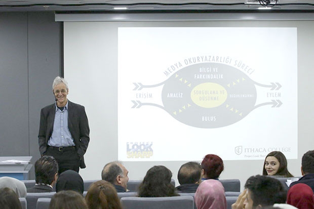 Açılış konuşmasının ardından sunumunu gerçekleştiren Christopher Sperry, medya okuryazarlığı eğitimlerini anlattı. Medyayı bilinçli ve etkili kullanmanın önemini dile getiren Sperry: “ Medya mesajlarını ele alırken eleştirel düşünceden faydalanmak gerekir. Farklı kaynaklardan yararlanırken bilginin doğruluğunu ve güvenirliliğine bakmak lazım. Sorgulama alışkanlığını geliştirerek medya mesajları analizinde gerekli soruları sormamız çok önemli” dedi. Sunumunda, medya manipülasyonlarından da (hileli yönlendirme) örnek veren Sperry, etik kuralların önemine değindi.