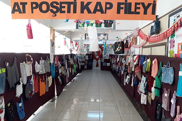 Doğal dengenin korunmasına yönelik etkinlikler kapsamında Ahmet Yesevi İlkokulu yeni bir ilke imza atarak “At poşeti, Kap Fileyi” sloganıyla başlattığı etkinlikler kapsamında öğrencilerin ve velilerin hazırladığı market çantaları ve pazar fileleri sergisini açtı.