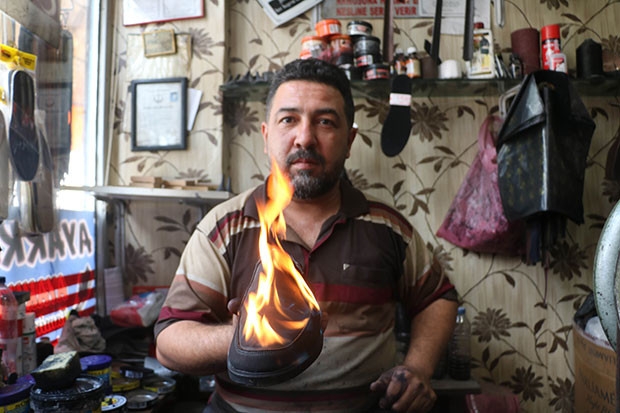 Gaziantepli ayakkabı tamircisi ve boya ustası Erdal Özcan, 20 yıl önce açtığı iş yerinde Türkiye'nin farklı illerinden gönderilen ayakkabıları, kendi geliştirdiği yöntemle boyuyor. Ayakkabıları yaklaşık 50 dereceye ulaşan ateşle yakarak boyayan Özcan, önce ayakkabıların üzerine kendi geliştirdiği bir madde sürüyor. Maddeyi çakmakla tutuşturan Özcan, daha önceden kalan boya kalıntılarını tamamen yakarak orijinal rengine dönüştürdüğü ayakkabıdaki kırışıklıkları düzelttiğini belirtti.
